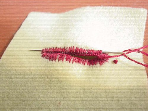 針拉起後在同一孔位置往下戳,然後從釦洞穿出,縫線繞過針,然後拉起。 ↓