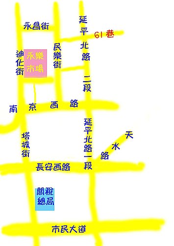 捷運坐到台北火車站,往後站台北地下街走〈即市民大道正下方的地下街〉,從延平北路出口上去,延著延平北路走,延路都是手工藝材料行,在往前至南京西路口,斜對面走至迪化街,走進去就看到永樂市場。
